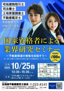 2025年10月25日土曜日、13:30-15:30から「国家資格者による業界研究セミナー」を他士業界連携で開催いたします。会場はTKP札幌ビジネスセンター赤煉瓦前ホール5Hになります。 最近は、国家資格試験を志望する若 […]